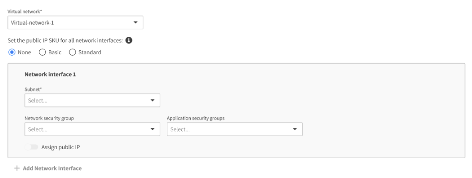 • Public IP SKU for all network interfaces. If you need to assign a public IP to your VM, select the SKU for all the public IP addresses that will be defined for the VM.