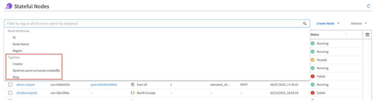 Click + Add Tag to add tags you want the VMs to be created with. Tagged stateful nodes can be filtered by tag keys and values on the Stateful Nodes page.