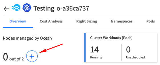 After you have successfully completed creating your Ocean cluster, click the plus sign under Nodes managed by Ocean.